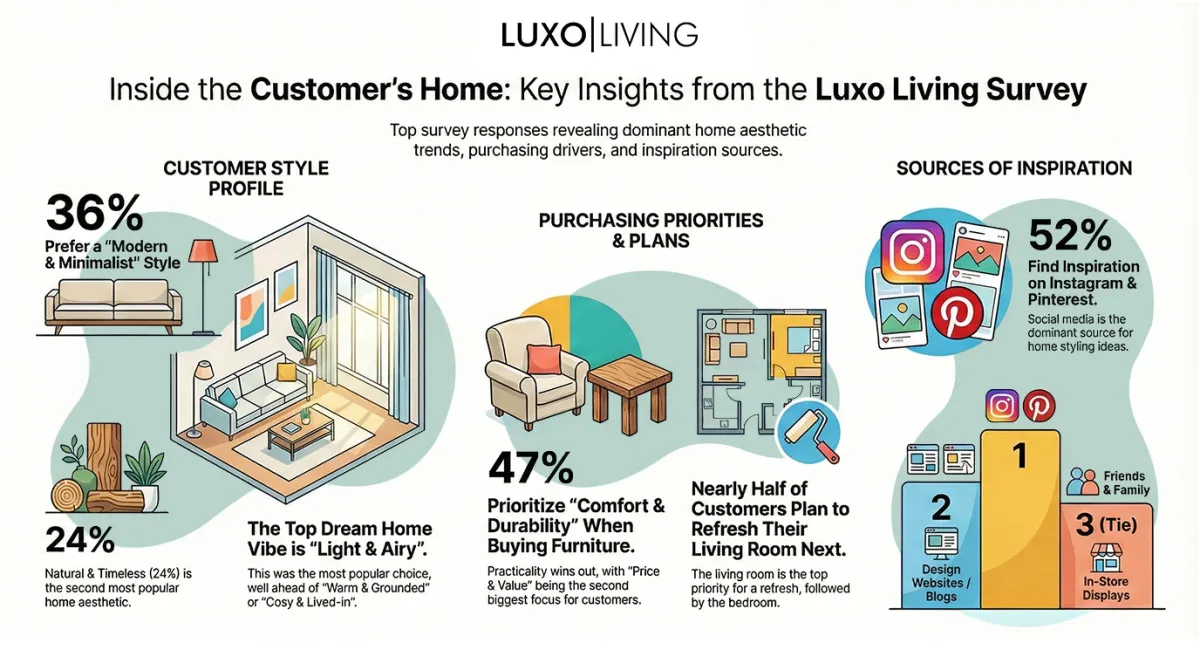 Luxo Living said the findings point to a shift in how people plan and furnish their homes, noting that homeowners increasingly want spaces that work for daily life.