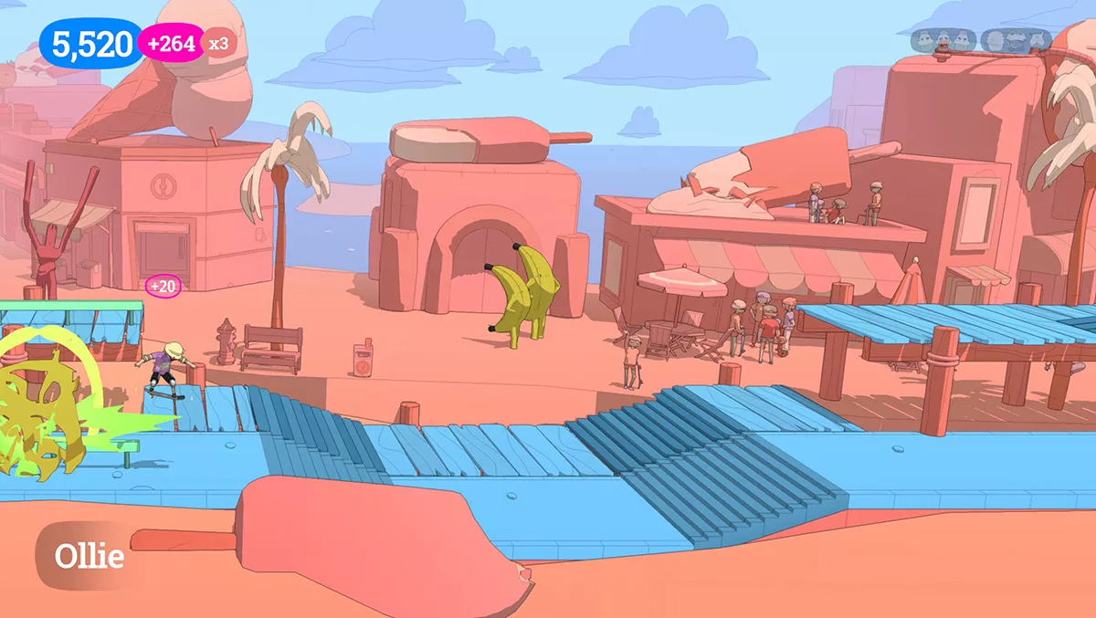 The game world is made up of areas, each with its own unique look. Players work their way around the map via short skate runs. The initial idea is to jump over hazards and grind rails to get to the finish line. After a while, tricks are added into the equation.