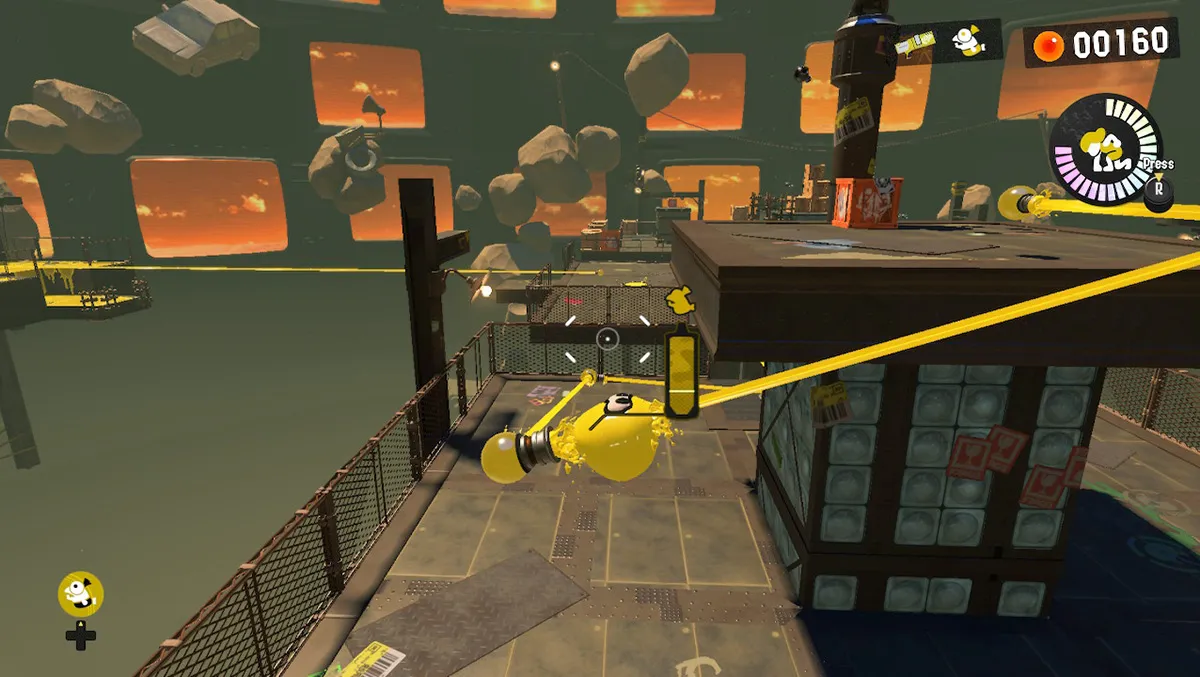 The player's character has two forms: one humanoid and the other looking like a squid without tentacles. In humanoid form players can fire an ink gun, covering floors and walls with ink splats, The ink can also be used to activate objects and dispatch enemies. As a squid, the player can swim under ink splats, quickly across floors, and even up walls. If it's covered in your ink you can move through it. If it's another colour ink it'll slow you down, or even injure your character. In squid form, your character can also pass through mesh objects.