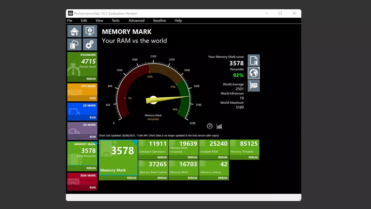 Using Performance Test 10.1, the XLR8 Gaming MAKO DDR5 achieved a Memory Mark of 3578, that's a 92%-tile score. The DDR4 equipped machine I'm using to type this achieved a 3227 Memory Mark, that almost half the database operations, a 25% lower read uncached score, and a third of the DDR5 memory threaded score. The latency of the DDR5 memory was higher, something I noticed when looking at the timings, and common across these early DDR5 modules.