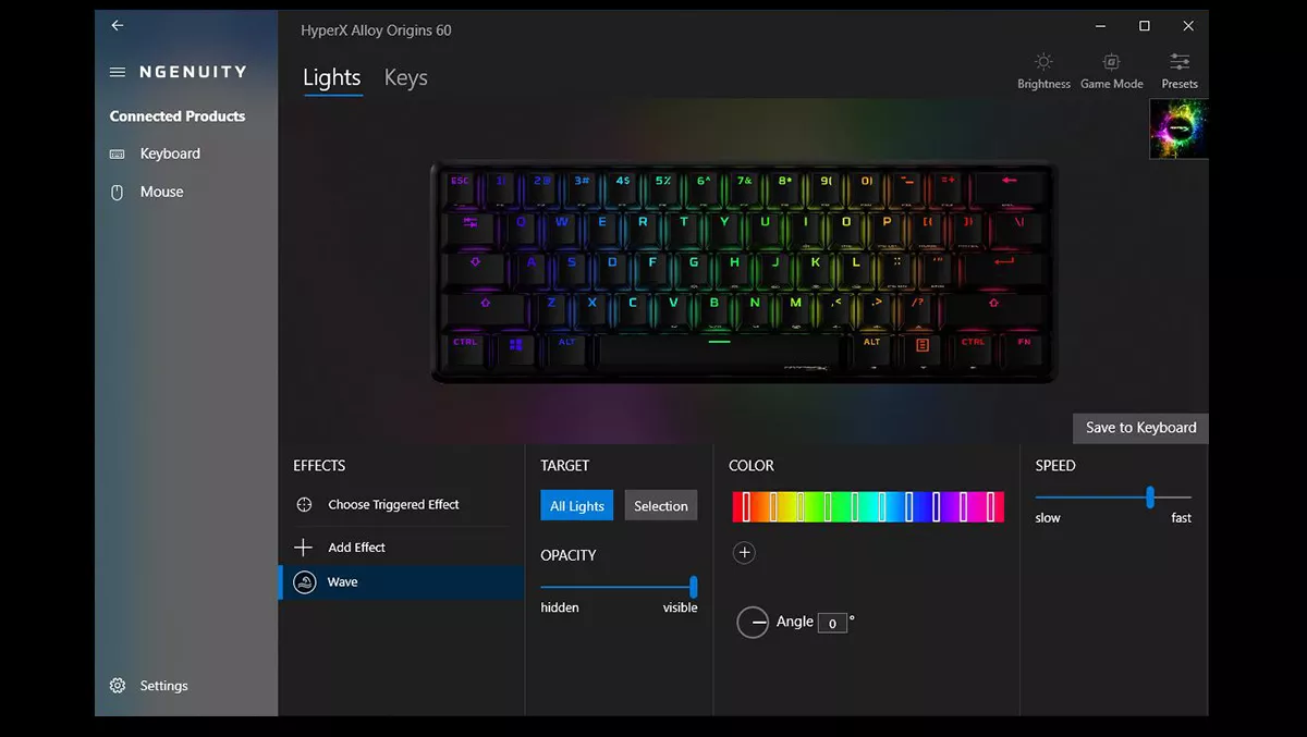 Using HyperX's NGENUITY beta application, the keyboard's RGB lighting can be set up and keys reassigned. NGENUITY also works with HyperX mice and memory to coordinate the lighting effects. The Alloy Origins 60 RGB lighting is very nice. The versatile application can apply RGB effects to only certain keys or even assign certain presets on a per-game basis. Outside of the application, the keyboard has three presets that can be selected and the brightness adjusted.
