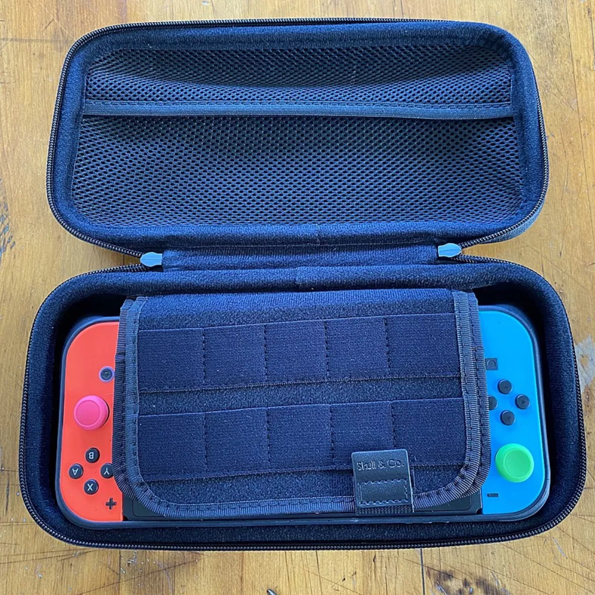 The Switch with it's GripCase Body attached slots perfectly into a mould, and also features a sleeve with 10 game card slots, as well as a mesh pocket with an overlapping cover where you can keep excess cables.