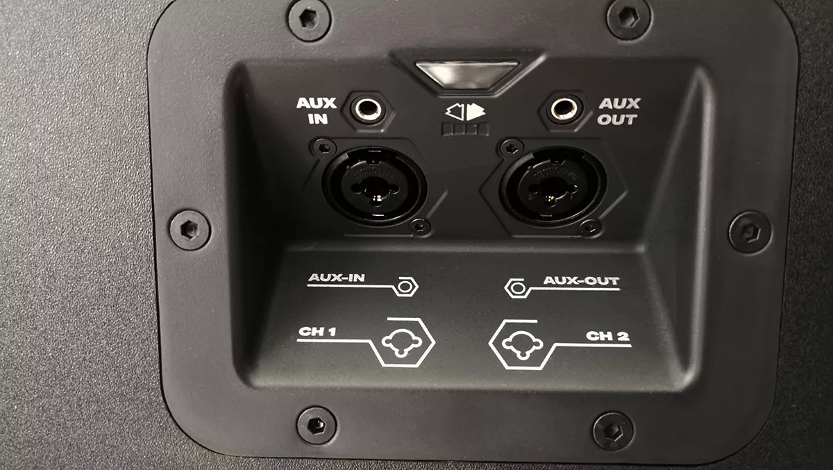 The rear of the speaker has a unique ID plate that matches the devices Bluetooth ID, perfect for professional settings whereby multiple speakers and equipment is in use. Below that are two microphone/instrument (XLR, 1/4") inputs as well as a 3.5mm stereo input and a 3.5mm stereo output. There's even a socket on the bottom of the speaker for an optional stand to elevate the sound to new heights.