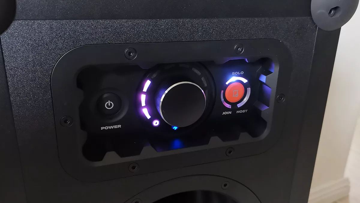 On the right side of the speaker there's a recessed panel. Here you can find the on button, illuminated volume knob and a button to switch the speaker from solo mode to pairing with other Soundboks speakers (which I can only imagine how awesome that would be).