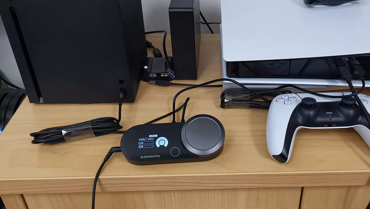 I set up the headset connecting the Gamedac's Xbox USB cable to an Xbox Series X and the other USB cable to a PlayStation 5. The Gamedac switches input automatically depending on which console was switched on. Both the Xbox and PlayStation automatically detected the headset and microphone.