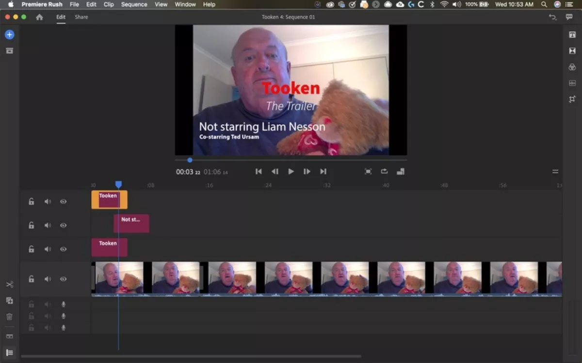 Premiere Rush allows you to add media clips, titles, transitions, and voiceover tracks. It has simple interface that's designed to help you get your product complete and uploaded to your favourite social media platform in short order. I managed to create mine just using a webcam and a USB microphone.